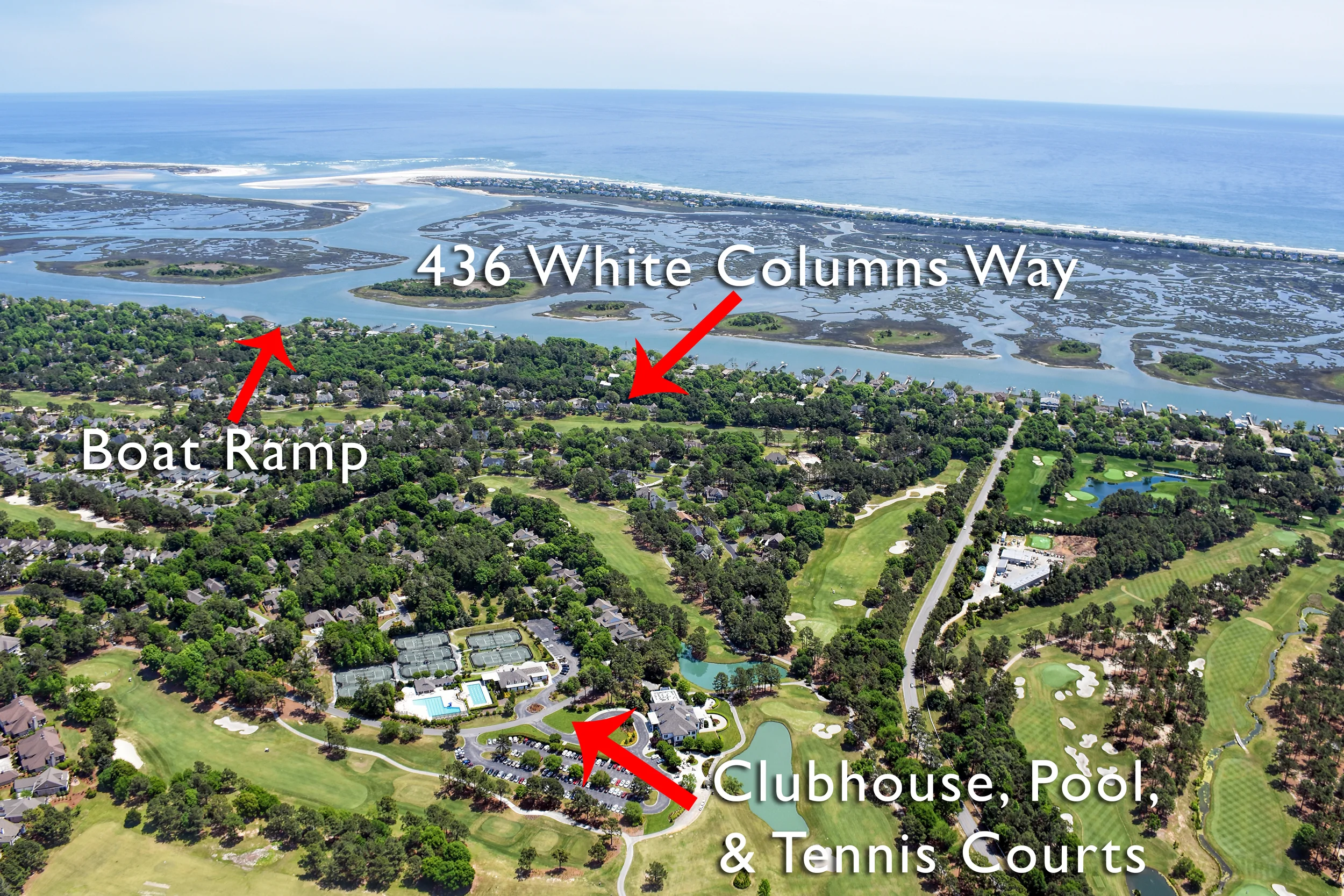 /Below is a great example of one of our aerial photos in Porters Neck Country Club. The photo really shows how close this property is to the ICWW, Boat Launch, Golf Course, and Country Club.